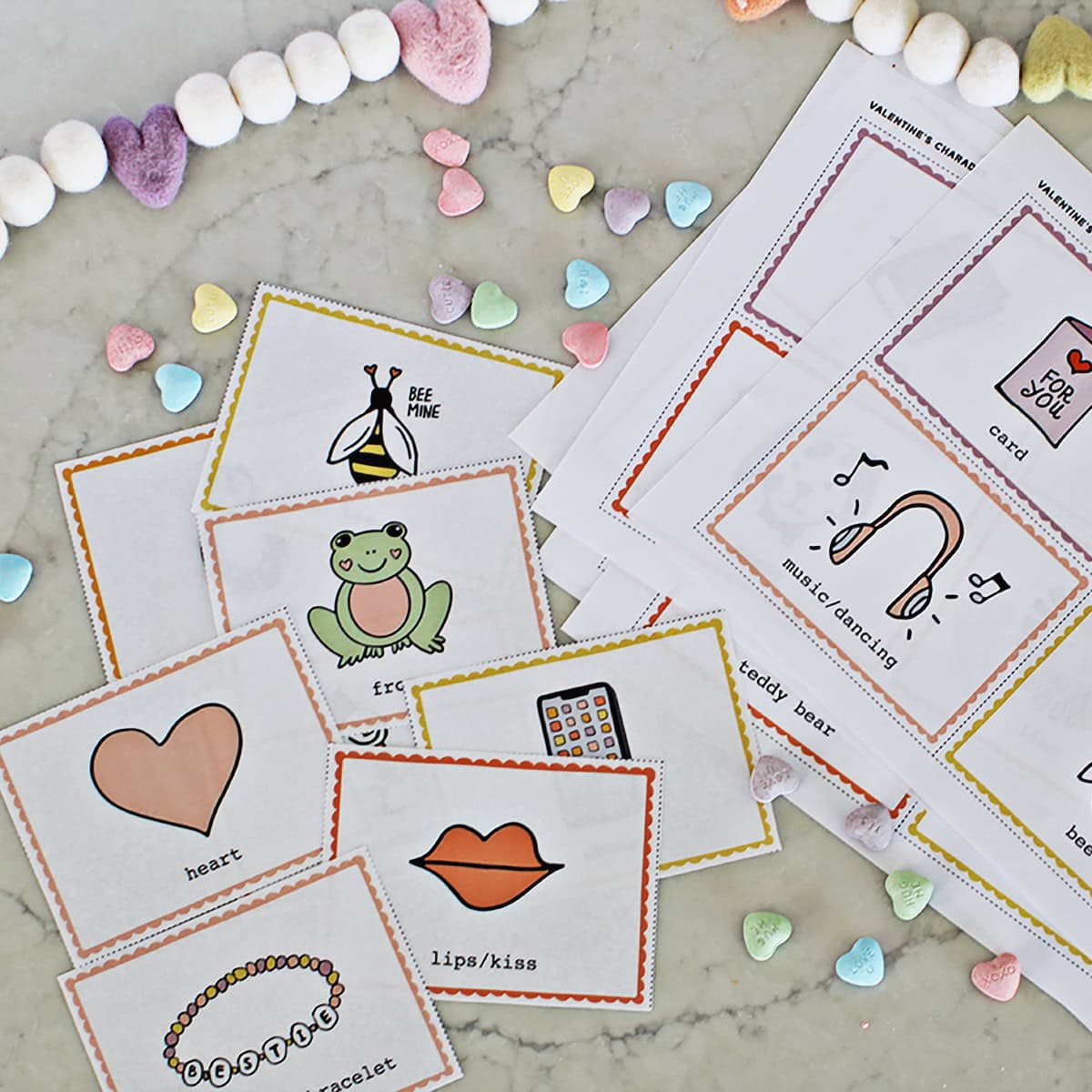I was in charge of the game for my son’s kindergarten Valentine’s Day party, and one of our favorite games to play at home is charades, so I decided to make a printable version that we could use for his class too!